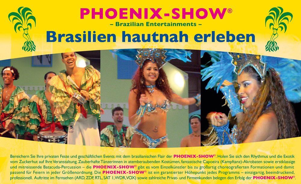 Zauberhafte Tänzerinnen, fantastische Capoeira-Akrobaten sowie erstklassige und mitreissende Batucada-Percussion werden Ihre Gäste begeistern. Die PHOENIX-SHOW ist in verschiedenen Aufstellungen - vom Einzelkünstler bis hin zur grossartig choreografierten Formation - buchbar. Damit lassen sich brasilianische Show und Batucada-Auftritte individuell an Feiern jeder Größenordnung anpassen.